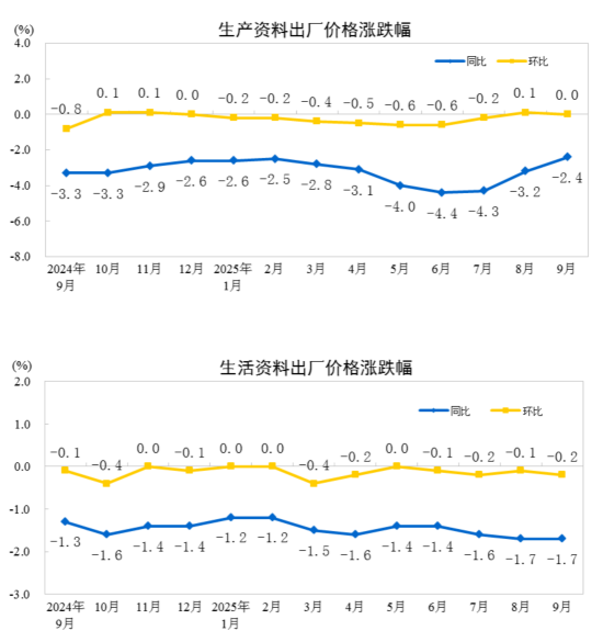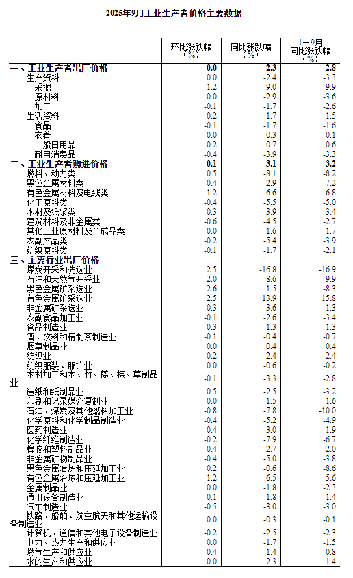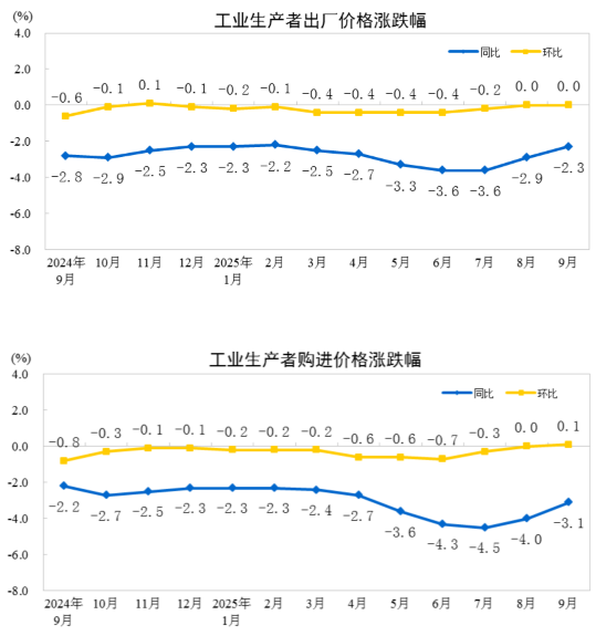 2025年9月份,全国工业生产者出厂价格同比下降2.3%,降幅比上月收窄0.6个百分点,环比继续持平。工业生产者进价同比下降3.1%,降幅比上月收窄0.9个百分点,环比上涨0.1%。1—9月平均,工业生产者出厂价格比上年同期下降2.8%,工业生产者进价下降3.2%。